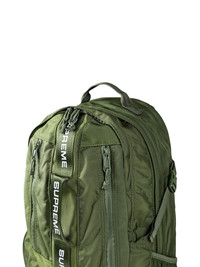 logo strap backpack Supreme is back with its iconic streetwear staples. This olive green backpack has a water-resistant construction, made of Cordura recycled nylon, and features a spacious design enhanced with the brand's logo on the front and back. Imported Composition Outer: Nylon 100%