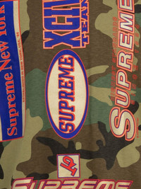 multi logo T-shirt The Supreme multi logo T-shirt is an all-cotton short-sleeve piece, from the New York streetwear brand’s AW21 season, that features an array of ‘90s-inspired logos. In this design, the brand supplies multiple logos on the front, all of which appear in black and gold while an 'XCIV Team' print is mixed into the assemblage of logos to complete the look. Made in United States Composition Cotton 100%