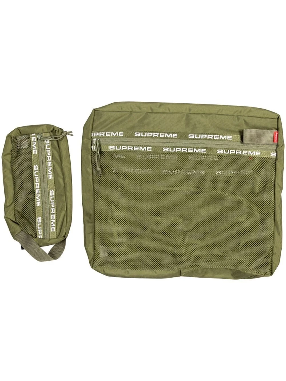 Organizer "Olive" pouch set Supreme lends its signature branded aesthetic to travel accessories with this Organizer pouch set. Arriving in an earthy olive-green hue, the pair are embellished with logo prints along the zippers for a recognisable finish. Highlights - Olive green - Recycled nylon - Logo print to the front - Front zip fastening - Mesh panelling - Rectangle shape - Set of two Imported Composition Recycled Nylon 100%
