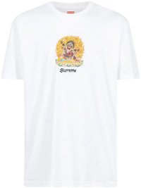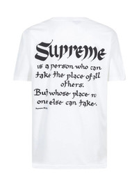 Person short-sleeve T-shirt The Supreme Person tee, in white, is one of multiple colours of the all-cotton short-sleeve T-shirt by the famous streetwear brand. This model features a unique Hindu-inspired graphic on the chest with black Supreme branding underneath. On the back, a slogan detail - 'Supreme is the person who can take the place of all others. But whose place no one else can take' - completes the design. Highlights - White - Cotton - Graphic print at the chest - Logo print to the front - Logo print to the rear - Round neck - Short sleeves - Straight hem - These styles are supplied by a premium sneaker marketplace. stocking only the most sought-after footwear, they source and curate some of the most hard to find sneakers from around the world. - When buying this unisex item, keep in mind that it is graded in standard men's sizing. Made in United States Composition Cotton 100%