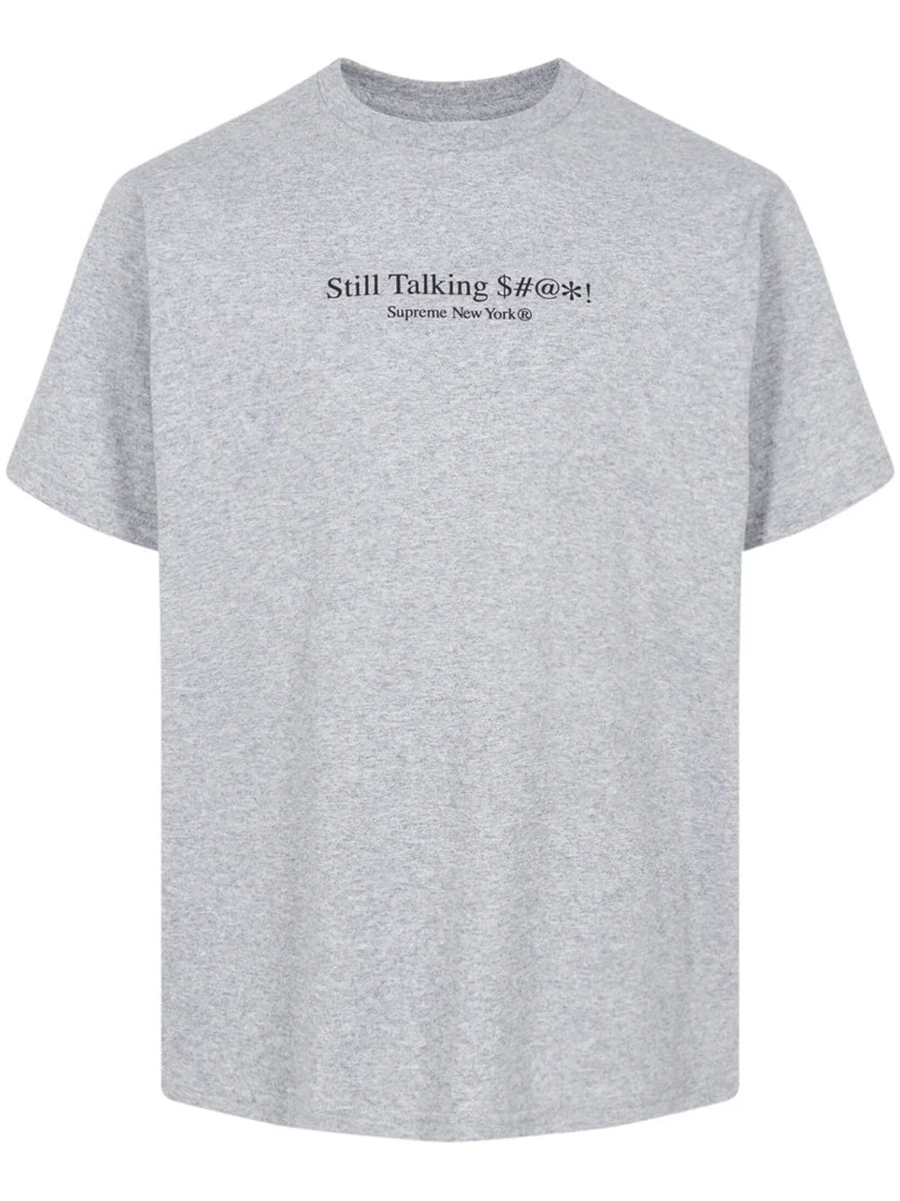 Still Talking crew-neck T-shirt Following the brand's casual yet bold style, the Still Talking T-shirt from Supreme's AW22 collection arrives in a grey hue, enhanced by a slogan print on the front and a logo print on the back. Its design is crafted from cotton and has a straight, relaxed cut. Made in United States Composition Cotton 100%