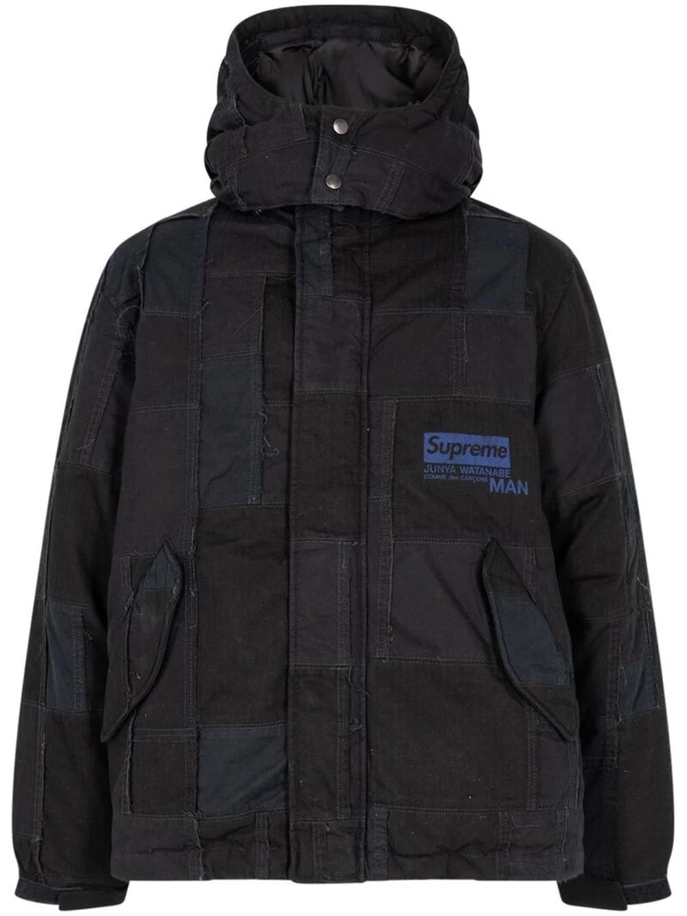 x Junya Watanabe "Comme Des Garcons" patchwork puffy jacket This black jacket is part of Supreme's debut collaboration with Junya Watanabe. It's crafted from cotton and features a patchwork design, elevated with contrasting logos from the two brands at the chest. Highlights - Black - Cotton - Patchwork design - Classic hood - High neck - Concealed front fastening - Long sleeves - Logo print at the chest - Two side flap pockets - Straight hem - When buying this unisex item, keep in mind that it is graded in standard men's sizing. Made in United States Composition Outer: Cotton 100%