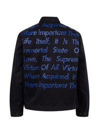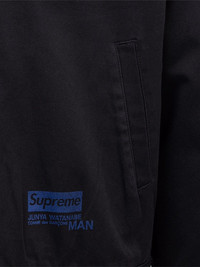 x Junya Watanabe printed work jacket Designed in collaboration with the Japanese fashion designer, Junya Watanabe, this black shirt jacket stands out thanks to the slogan print on the back in a blue hue. Its design is crafted from cotton and features a Supreme x Junya Watanabe CdG Man logo on the front. Made in United States Composition Cotton 100%
