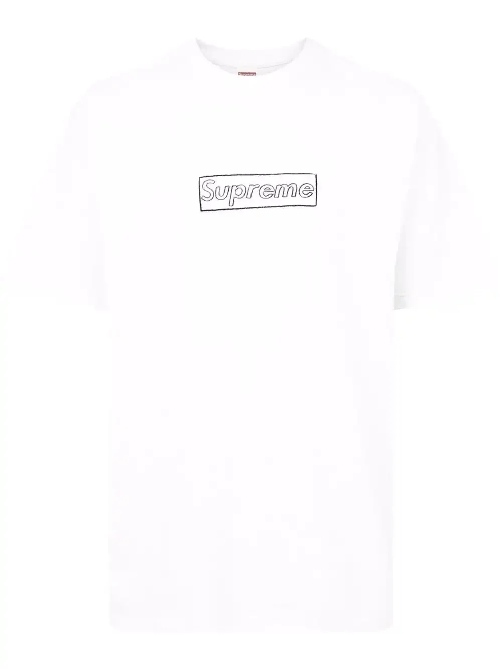 x Kaws Chalk Logo T-shirt The Supreme x KAWS collaboration is back for the autumn-winter 2021 collection. Reminiscent of the iconic box logo, this white cotton design is anchored with a white chalk outline logo which has so far been deemed the most popular item in the drop of over 250 pieces. Highlights - White - Cotton - Signature box logo - Round neck - Short sleeves - Straight hem - When buying this unisex item, keep in mind that it is graded in standard men's sizing. Made in United States Composition Cotton 100% Washing instructions Machine Wash