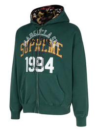 x MM6 Maison Margiela zip-up hoodie Designed in collaboration with MM6 Maison Margiela, this zip-up hoodie is stamped with a white logo print atop Supreme's yellow graphic on the chest. It is cut from soft fleece with brushed backing in a green hue, ensuring maximum comfort. Highlights - Green - Cotton - Logo print to the front - Drawstring hood - Front zip fastening - Two diagonal pockets to the sides - Drop shoulder - Long sleeves - Straight hem - When buying this unisex item, keep in mind that it is graded in standard men's sizing. Imported Composition Cotton 100% Washing instructions Read Manufacturer Guidelines