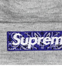 x New Era Box Logo knitted beanie Bandanas can be worn around your your neck. But everyone knows it is cooler on your head, wearing this heather grey wool Supreme x New Era Bandana Box Logo beanie. Choose the better option. Featuring a knitted style, an upturned brim, a front logo patch and embroidered details. Imported Composition Polyester 100%, Wool 100%
