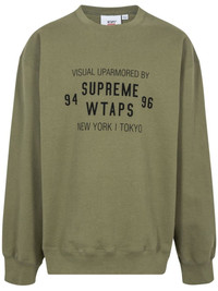 x WTAPS crew-neck sweatshirt This Supreme x WTAPS crew-neck sweatshirt features both brands' logos printed on an olive-green crewneck sweatshirt. The piece is crafted from cotton and features a relaxed cut. Highlights - Olive green - Cotton - Ribbed cuffs - Round neck - Long sleeves - Straight hem - When buying this unisex item, keep in mind that it is graded in standard men's sizing. Made in United States Composition Cotton 100%