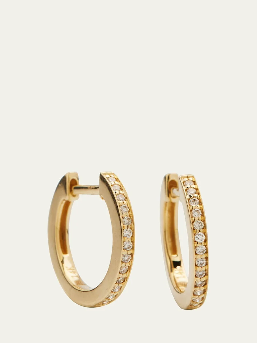 Sydney Evan diamond huggie hoop earrings. Polished 14-karat gold posts and hoops. White diamond pavé hoop silhouettes. 0.06 total diamond carat weight. Snap post backs for pierced ears. 0.5"Dia. Imported. Item Note: These earrings are sold as a pair. Online Inquiries: BGS21_Y68NJ| Store Inquiries: #2618494