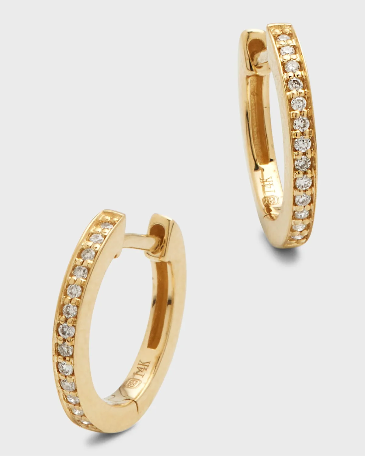 Sydney Evan diamond huggie hoop earrings. Polished 14karat gold posts and hoops. White diamond pave hoop silhouettes. 0.06 total diamond carat weight. Snap post backs for pierced ears. 0.5"Dia. Imported.