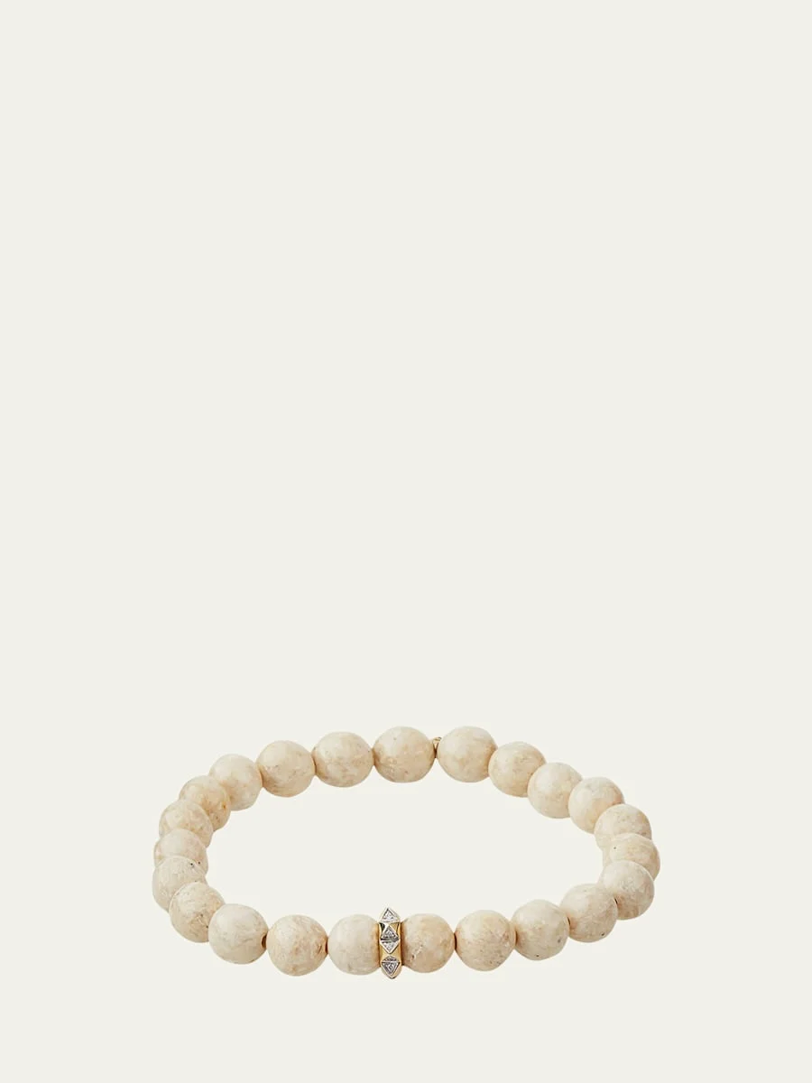 Sydney Evan beaded stretch bracelet. 14-karat rondelle bead and logo charm. 16 white diamonds at pyramid rondelle. 8mm round cream jasper beads. Approx. 6.25"L; 2.5" diameter. Stretchy; slip-on style. Online Inquiries: BGS21_Y5GXS| Store Inquiries: #3782982