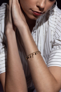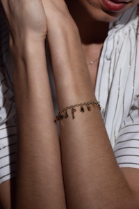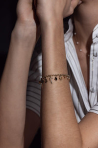 DETAILS AND INSIGHT Sydney Evan multi charm chain bracelet in yellow gold. 14K Yellow Gold multi-charm chain bracelet features a horseshoe, a bee, a starburst, a daisy, a hamsa, a moon, an evil eye, an elephant, a clover, a love, a peace sign, a saturn, a star, and a monstera leaf 7" L Style CB1595