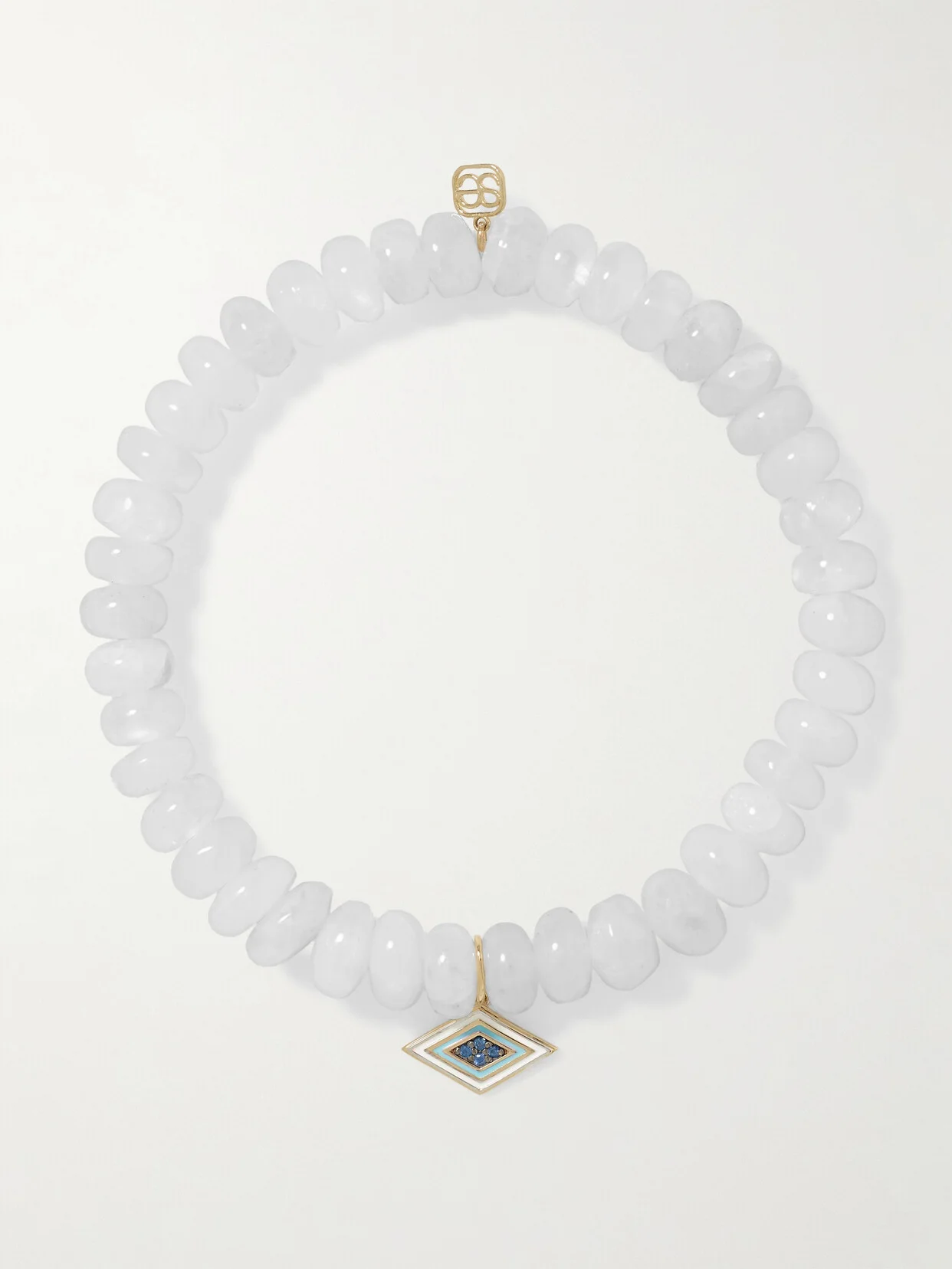 Sydney Evan's signature beaded bracelets are each created with their own unique design, so they feel really special worn alone and look great stacked together, too. Strung with moonstones, it has a 14-karat gold charm detailed with colorful enamel and 0.034-carats of sapphires.