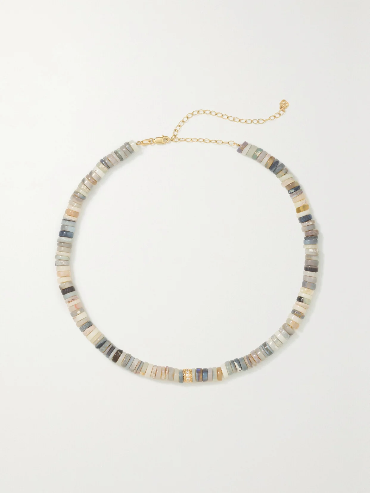 Sydney Evan's jewelry highlights the beauty of natural stones - this necklace is strung with Australian opals that range in color from gray to blue, to more traditional white. It's threaded with a single 14-karat gold rondelle at the center, which is encrusted with sparkling diamonds. Complement the short drop with longer pieces in your collection.