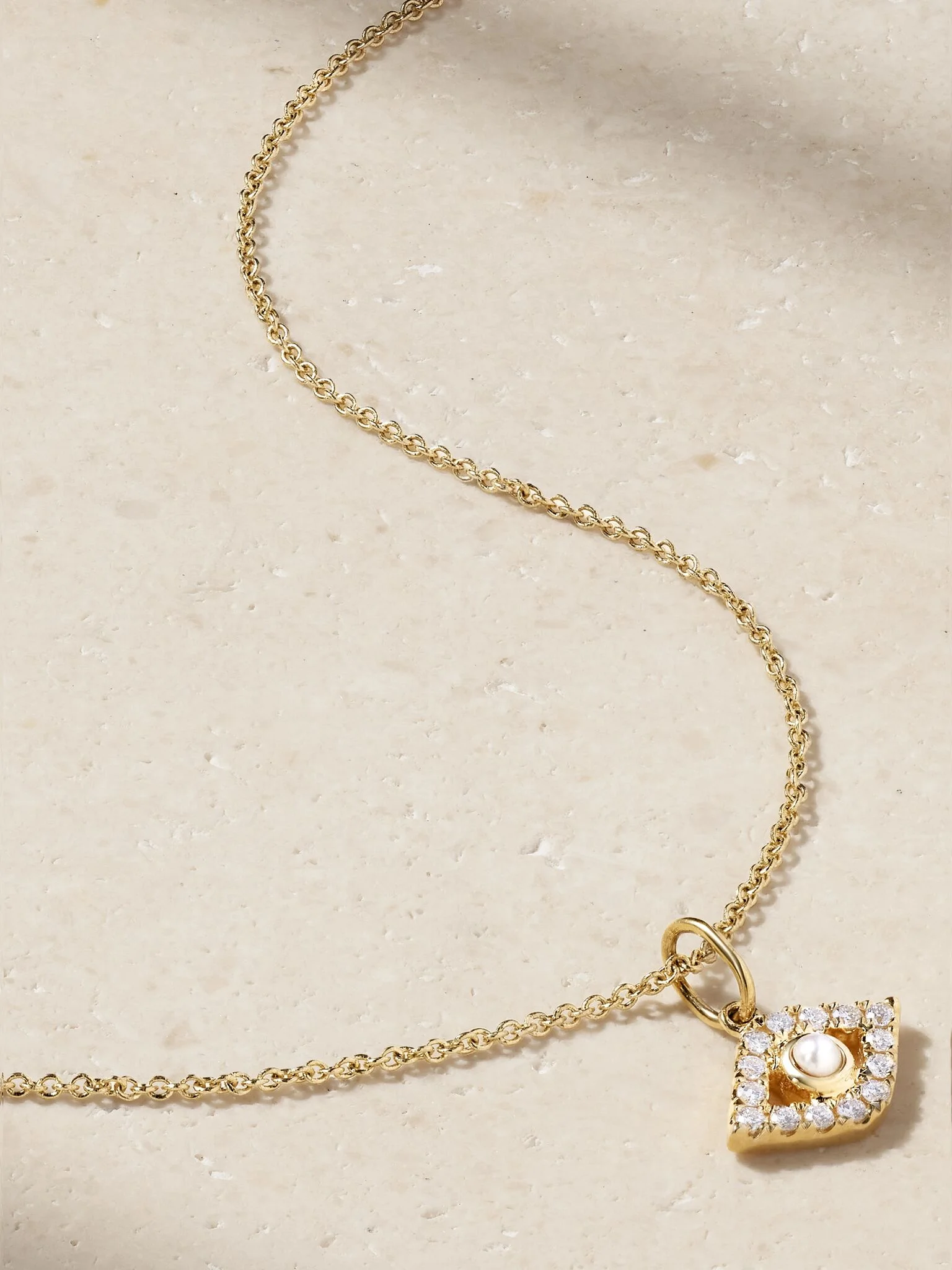 Sydney Evan's necklace features an evil eye - the designer says the ancient symbol is thought to protect against envy and misfortune. It's centered by a freshwater pearl 'iris' and outlined with twinkling diamonds. The slim chain will layer well with other delicate styles. Details & Care - Full-cut G-H SI2-I1 diamonds, total weight: 0.11-carats - Lobster clasp fastening - Freshwater pearls: China - Comes in a designer-stamped box