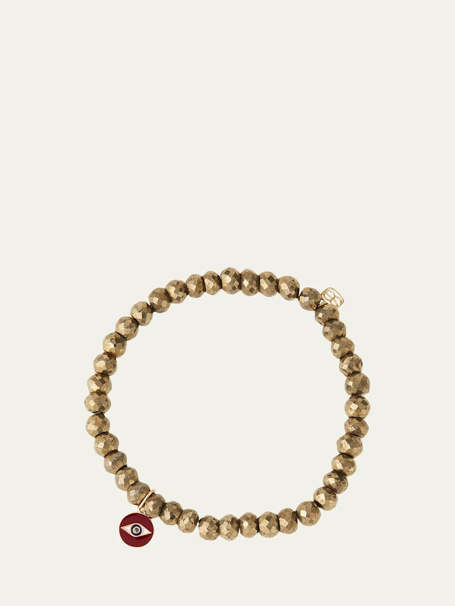 Sydney Evan pyrite and evil eye bracelet. 14karat yellow gold logo and disc charms. 6mm faceted pyrite champagne beading. Enamel evil eye disc with black diamond. 0.003 total diamond carat weight. Approx. 6.25"L; 2.5" diameter. Slipon style. Imported.