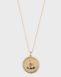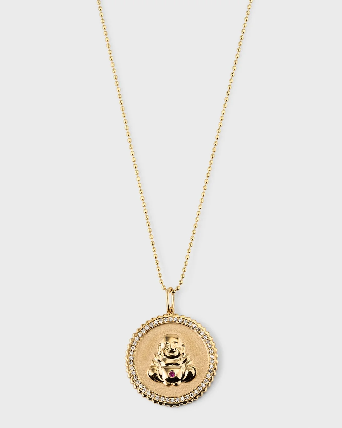 Buddha necklace from Sydney Evan. 14karat yellow gold as hardware. Coin pendant with sitting Buddha. Diamond s and ruby belly button. 0.15 total diamond carat weight. 0.01 total ruby carat weight. Approx. 18"L; 0.75"L coin. Imported.