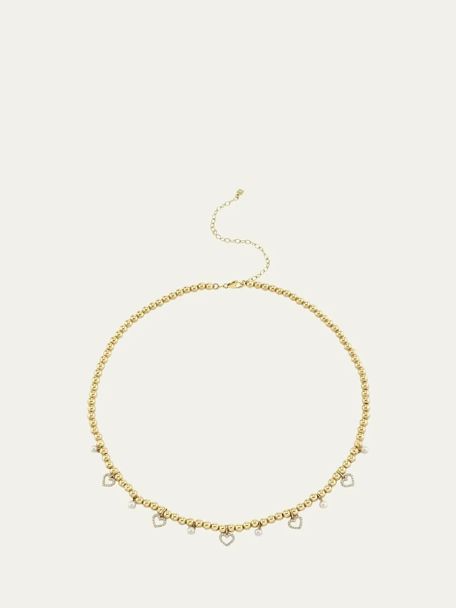 Strung with solid gold beads, Sydney Evan adds an alternating pattern of genuine pearls and diamondoutlined hearts to this beaded charm necklace. Approx. 1518" length Polished 14karat yellow gold 80 diamonds; 0.32 total carat weight Naturally hued freshwater uncultured pearls Adjustable length Lobster clasp Imported