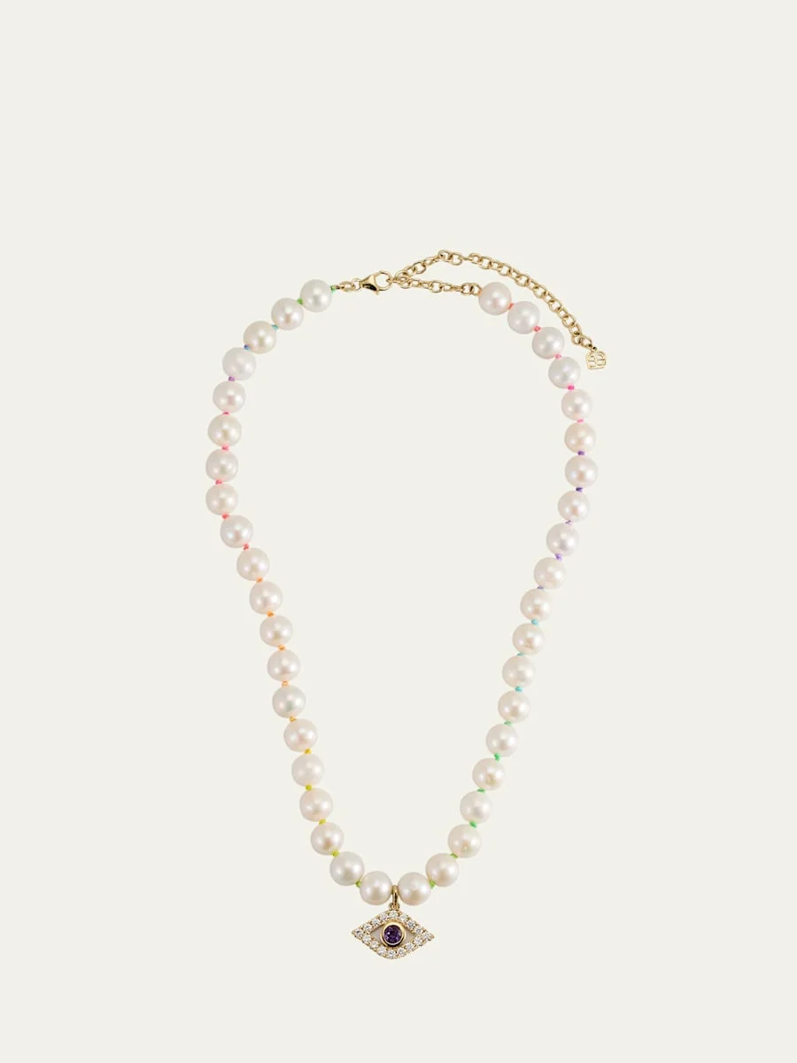 Sydney Evan charm necklace with multicolor neon thread Approx. 14"L 14-karat yellow gold Naturally hued graduated freshwater pearls Bezel amethyst and white diamond pavé 0.48 total diamond carat weight Adjustable length Lobster clasp Imported Online Inquiries: BGS21_Y73HD| Store Inquiries: #4743410