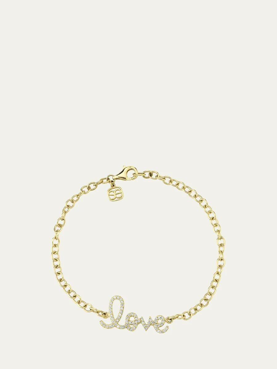 Crafted with love, this Sydney Evan chain bracelet is integrated with a diamond pave script. Approx. 6.75" length; 0.5" x 0.75" script Polished 14karat yellow gold Diamond total carat weight: 0.26 Lobster clasp Imported