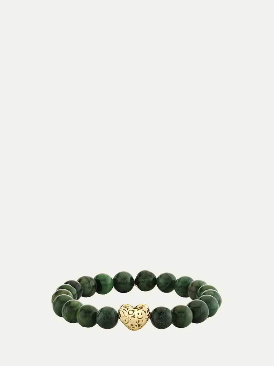 Symbols of good luck and positivity are present on this Sydney Evan green bead bracelet. Notice the heartshaped station that is composed of iconic motifs and finished with a high shine. Polished 14karat yellow gold Stretchy; slipon style Made in USA