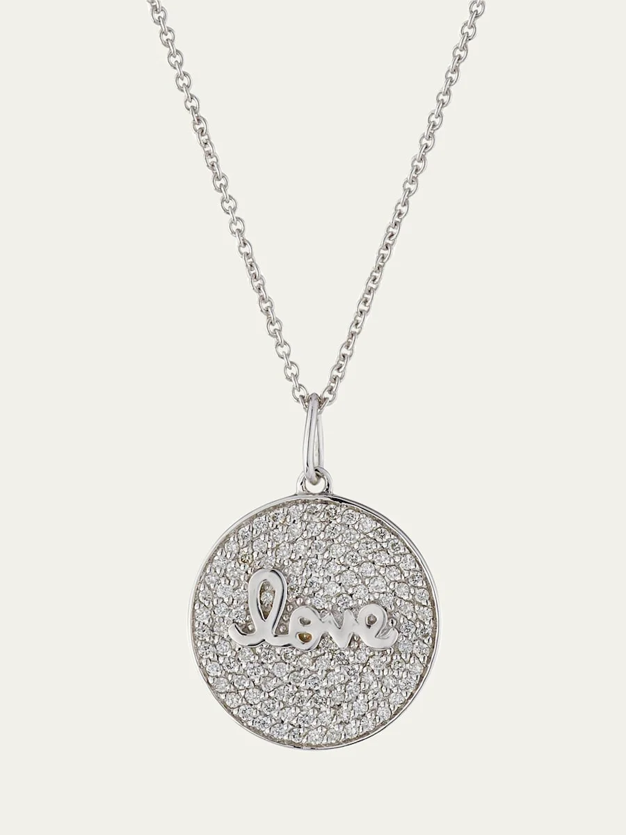 14k White Gold Love Script Diamond Pave Medallion Necklace