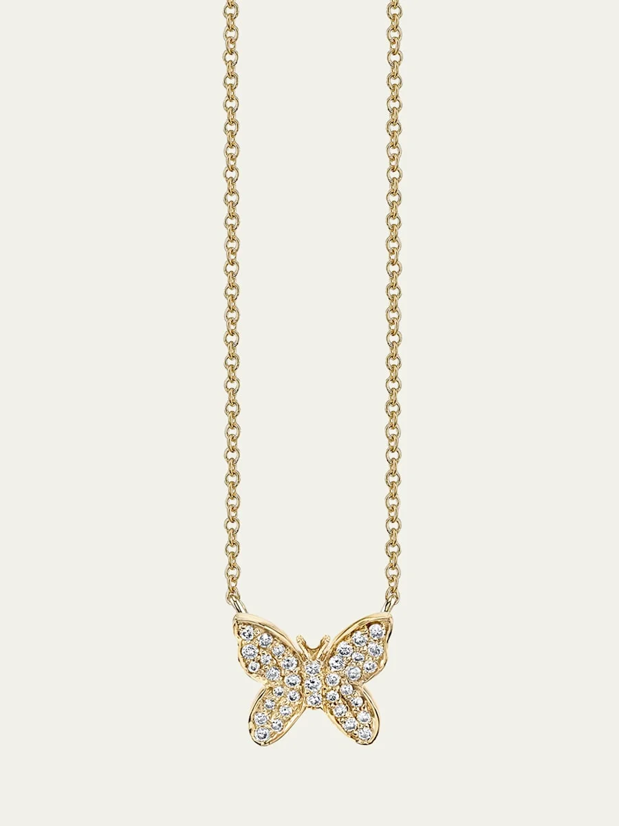 Sydney Evan butterfly necklace. 14-karat yellow gold as hardware. Integrated diamond pave butterfly. 35 diamonds; 0.10 total carat weight. Approx. 18"L. Online Inquiries: BGS21_Y5DDL| Store Inquiries: #2117074