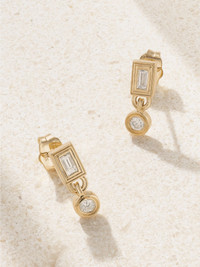 Sydney Evan's earrings are reminiscent of elegant Art Deco styles. Cast from polished 14-karat gold, they're bezel-set with baguette and round-cut diamonds - the intricate carved details make them feel so unique. Wear them for evening, sweeping hair half-up to show them off. Details & Care - Baguette and round-cut diamonds, total weight: 0.09-carats - Butterfly fastenings for pierced ears - Come in a designer-stamped box - This piece has been certified in accordance with the Hallmarking Act 1973