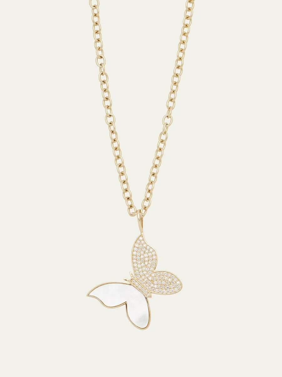 14K Yellow Gold Large Butterfly Charm Necklace with Pearl Inlay and Diamonds