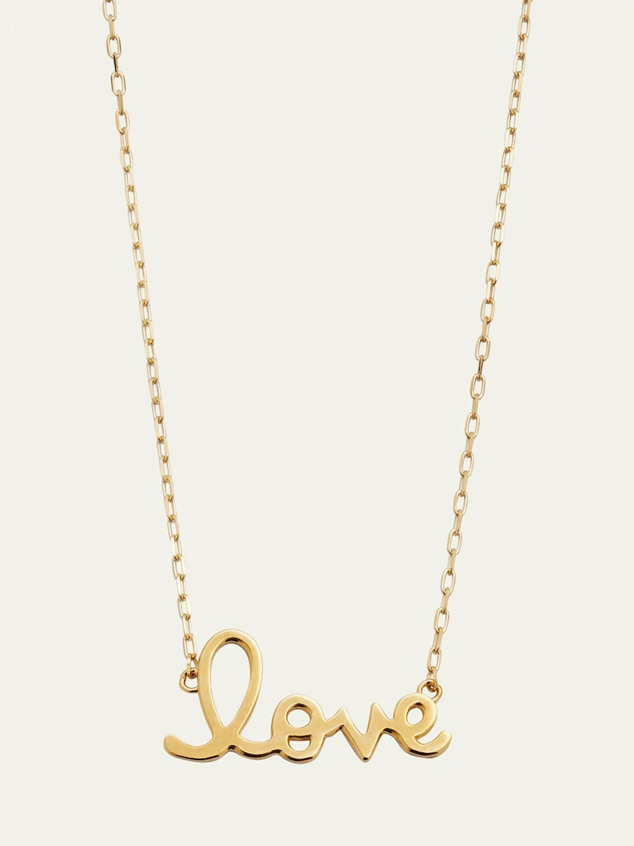 Sydney Evan pendant necklace from the Pure Collection. 14-karat yellow gold chain and "Love" script pendant. Approx. 16-18"L; 0.75"H x 0.4"W script. Adjustable; lobster clap. Imported. Online Inquiries: BGS21_Y4VKN| Store Inquiries: #3239661