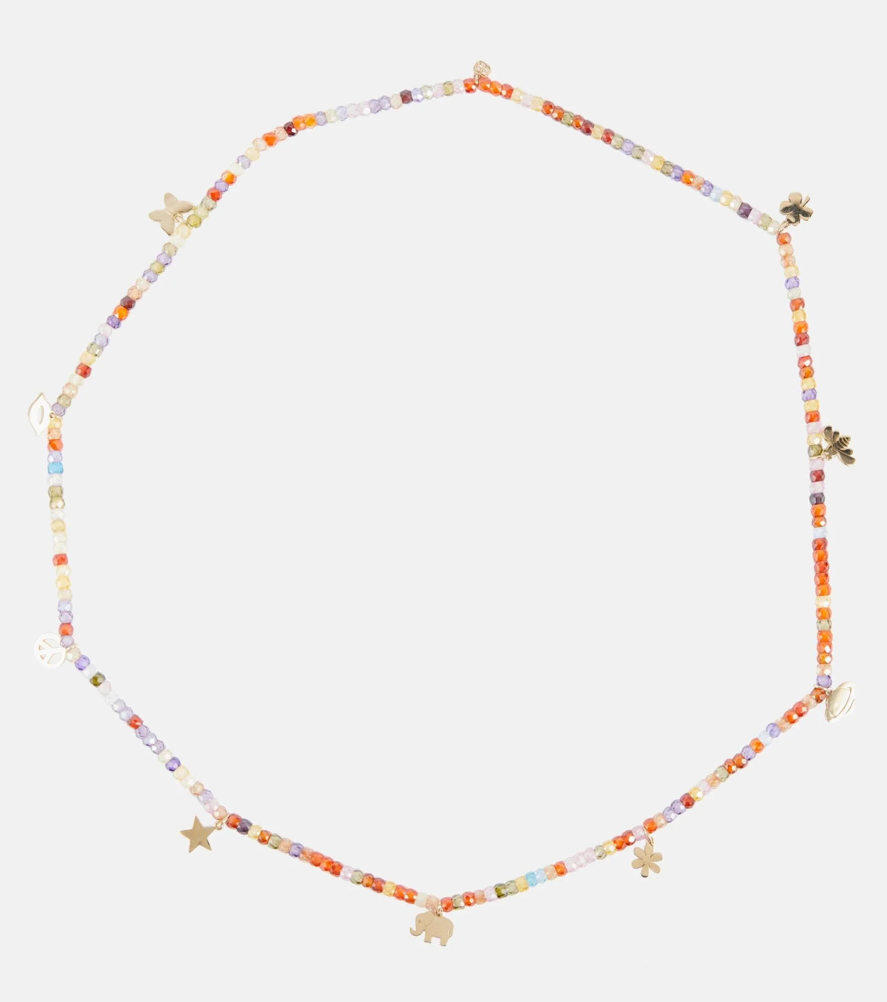 Made from 14kt gold, Sydney Evan's whimsical designs present a playful take on fine jewelry. Strung along stretch cord for the perfect fit, this bracelet is decorated with gorgeous 14kt yellow gold charms, from a tiny clover to a miniature butterfly. All charms are joined by 4mm rainbow zircon beads, the color and shape of which may differ due to the nature of precious and semi-precious stones. Product Details - Material: 14kt yellow gold - Made in Hong Kong - Stone I: zirconite - Designer color name: Rainbow - Item number: P00802212 Size & Fit - Width 3mm-0.1" - Elasticated band - Pendant length 9mm-0.35" - Pendant width 11mm-0.45"