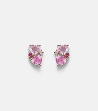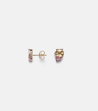These earrings from Sydney Evan are crafted from 14kt gold in a heart-shaped style. This design is embellished with pink sapphires that are contrasted with the gold and are elevated with a diamond on each side. Product Details - Material: 14kt yellow gold - Made in Hong Kong - Item color: gold - Stone I: sapphires - Stone II: diamonds - Item number: P01057420 Size & Fit - Max. width 9mm-0.35"