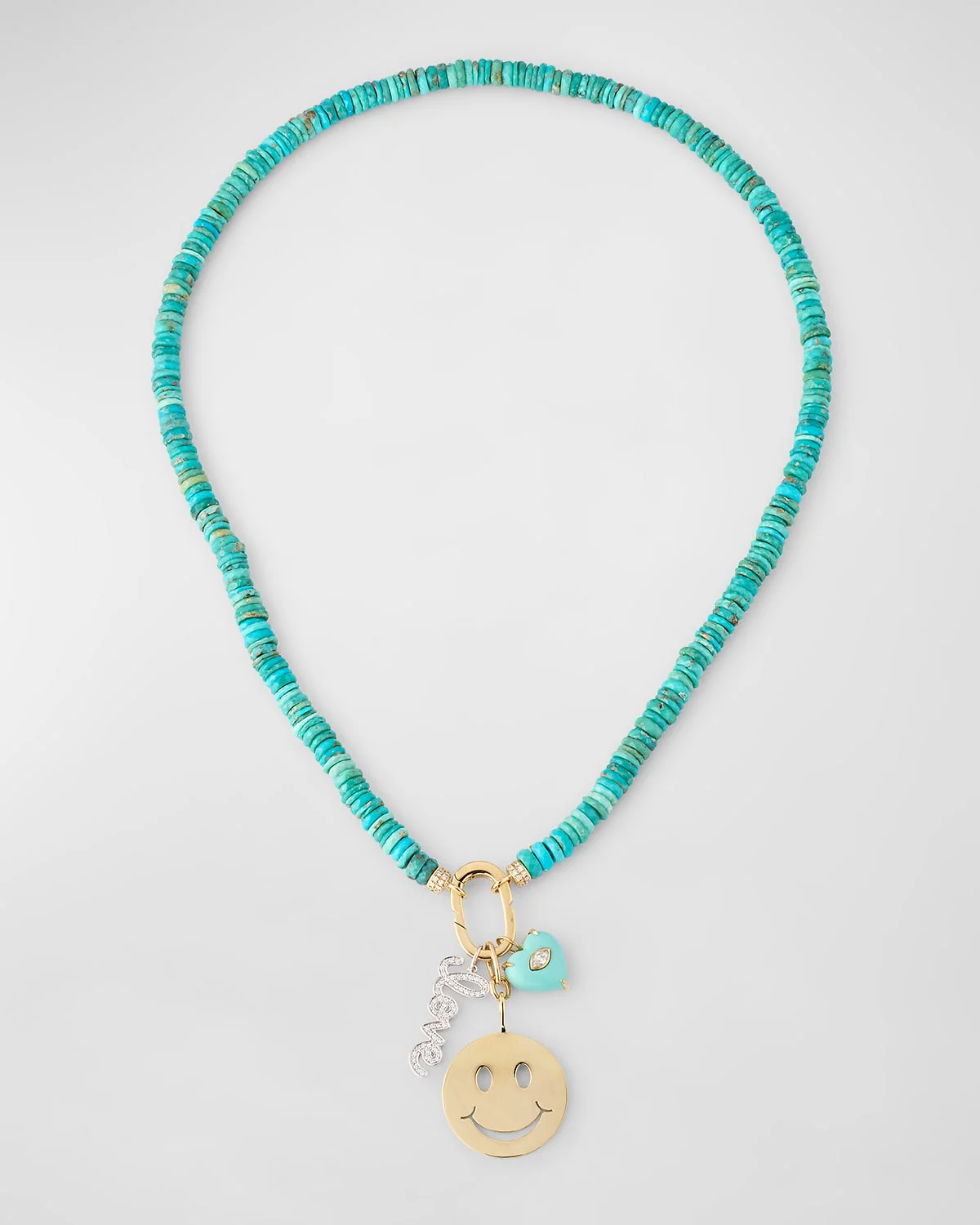Sydney Evan necklace with three charms Necklace length: approx. 17 inches Polished 14karat yellow gold Turquoise rondelles and heart 81 brilliantcut white diamonds Happy face, "love" script and heart charms 0.43 total diamond carat weight Carabiner closure Spot clean, wipe clean Imported