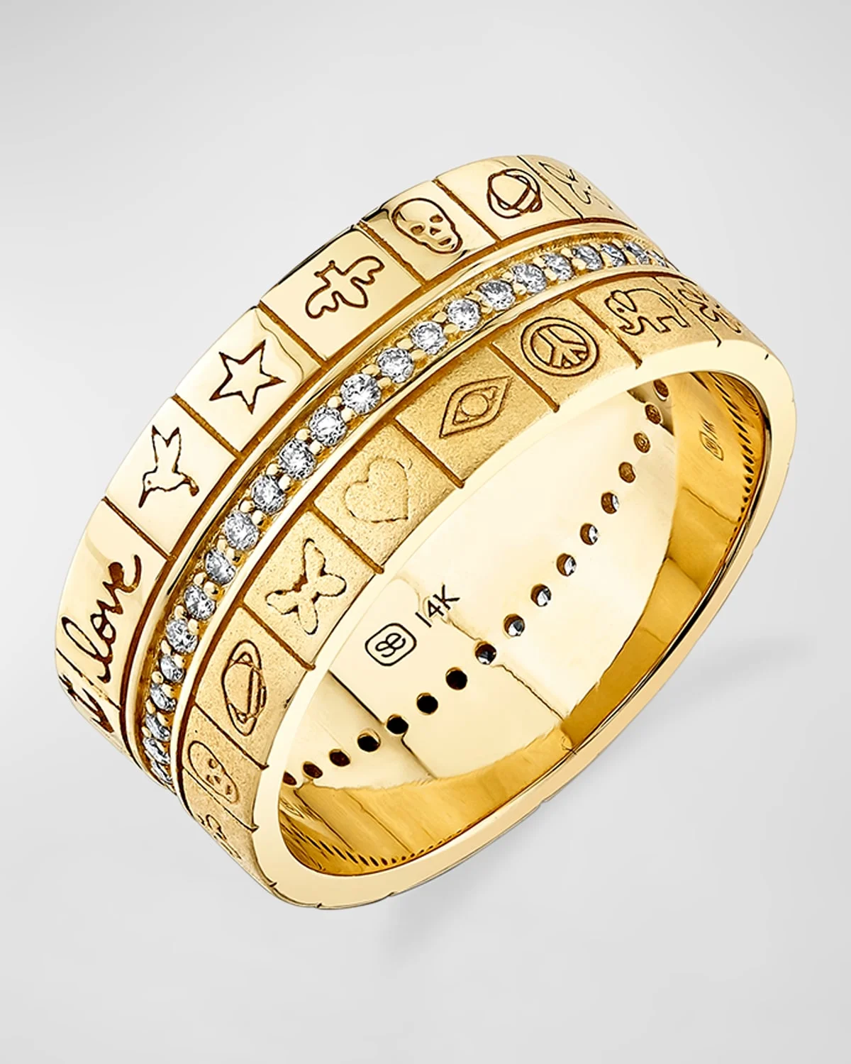 Sydney Evan ring is decorated with icon motifs Polished 14karat yellow gold 50 white diamonds at the center Diamond total carat weight: 0.26 Imported