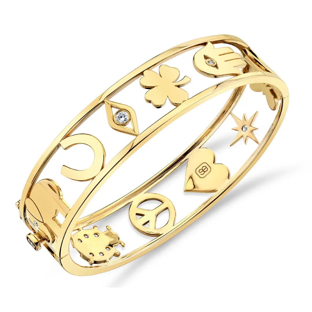 Radiating timeless elegance, this 14k yellow gold and diamond large hinge bangle showcases all our signature icons, each symbolizing the essence of strength, love, and transformation. Meticulously crafted to perfection, the shimmering diamonds accentuate the meaningful motifs, creating a piece that tells a story of connection and individuality. Designed exclusively in size 6.25"