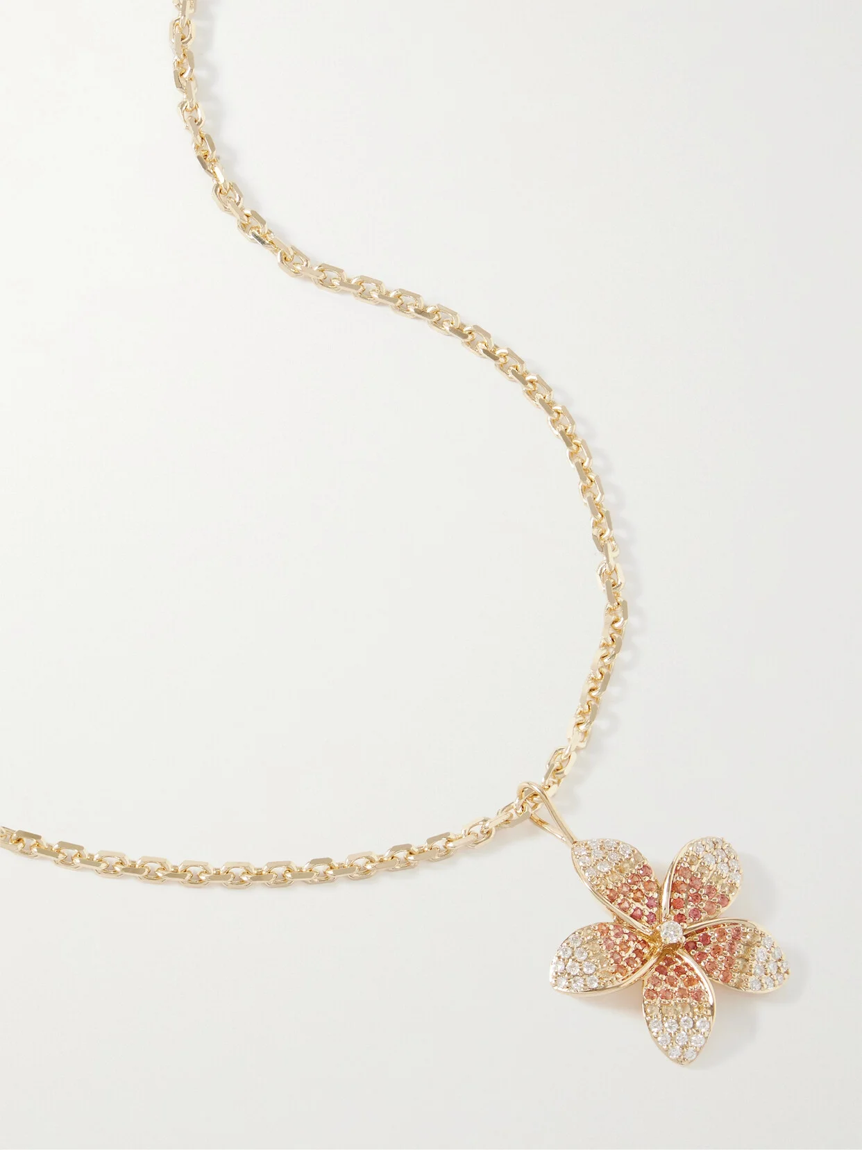 Sydney Evan's necklace is strung with a sizable 'Plumeria' pendant which represents love and new beginnings in Hawaiian culture. Strung on a 14-karat gold chain, it's dotted with an array of light-reflecting diamonds, as well as orange and yellow sapphires that add sparkle and color to each delicate petal.