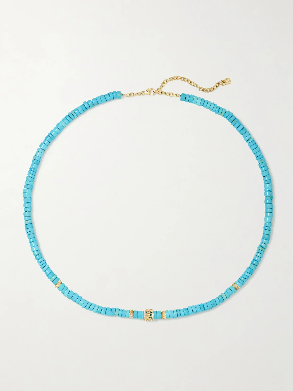Sydney Evan's 'Lucky Icon' necklace is strung with naturally shaped turquoise beads, each of which varies slightly in its color and veining. It has 14-karat gold charms that are encrusted with diamonds that subtly sparkle in the light. Adjust the drop to your preferred length.