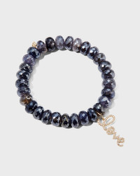 Sydney Evan bracelet Approx. 1/2"H x 7/8"W 14karat gold script and logo charms 10mm faceted iolite rondelle beads Medium "love" script with diamonds 63 brilliant round diamonds Diamonds total carat weight: 0.24 Slipon style Imported