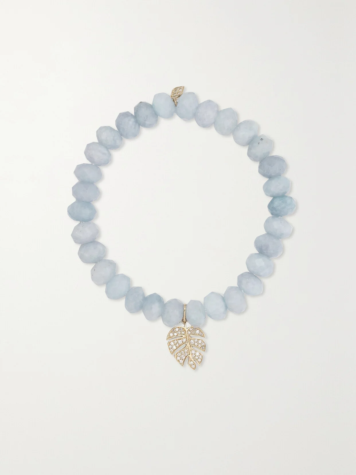Sydney Evan's pieces are known for their intricately detailed pendants that hold a sense of whimsy. Strung with a diamond-encrusted 14-karat gold Monstera leaf, this bracelet is threaded with chunky aquamarines. Make it a fun everyday signature.