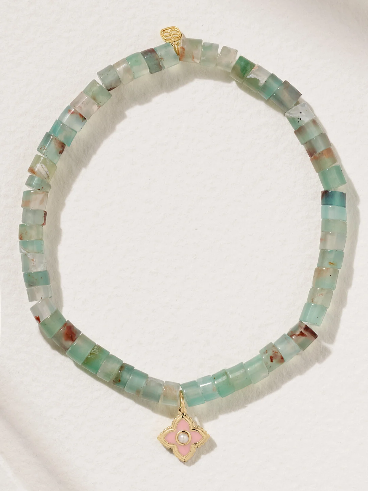 Moroccan Flower 14-karat Gold, Aquaprase, Enamel And Pearl Bracelet