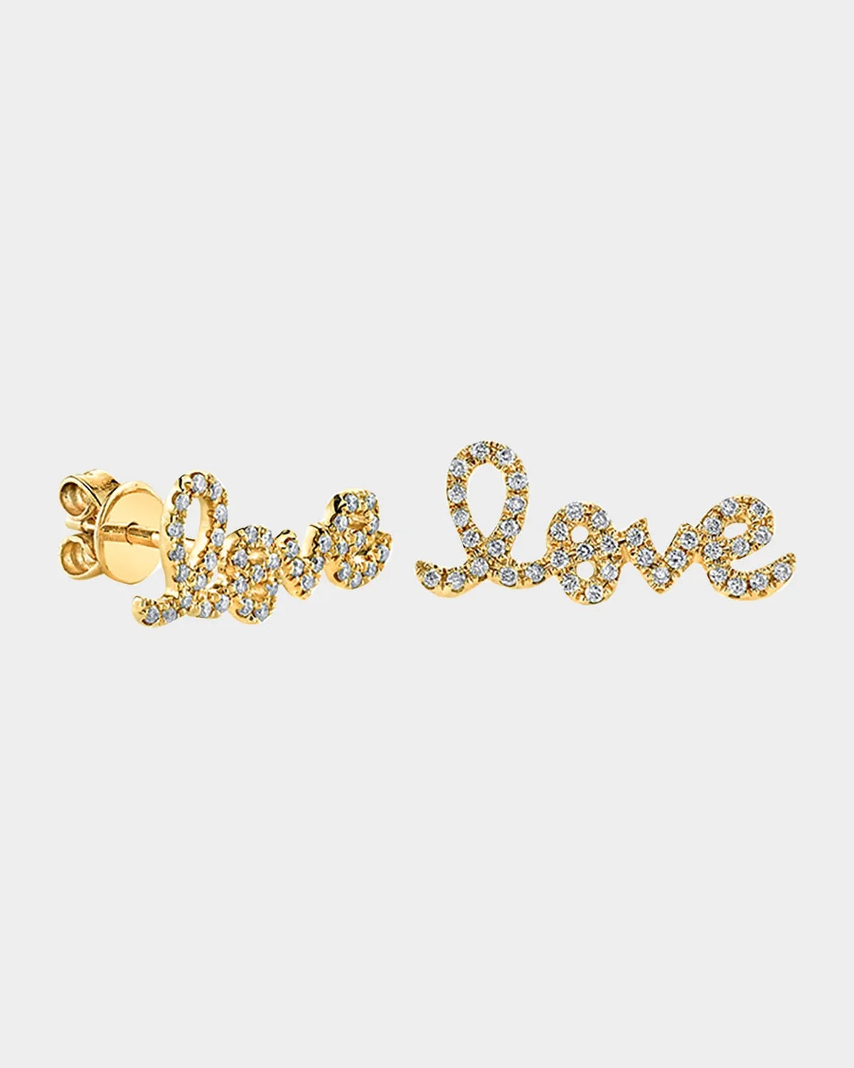 - Includes one earring; order two to complete your look, or mix and match with pieces in your collection. - 14-karat yellow gold. - Delicate "love" script stud earring with pave white diamonds. - 0.10 total diamond carat weight. - Approximately 0.4"W. - Post backs.