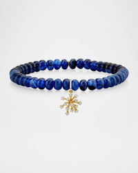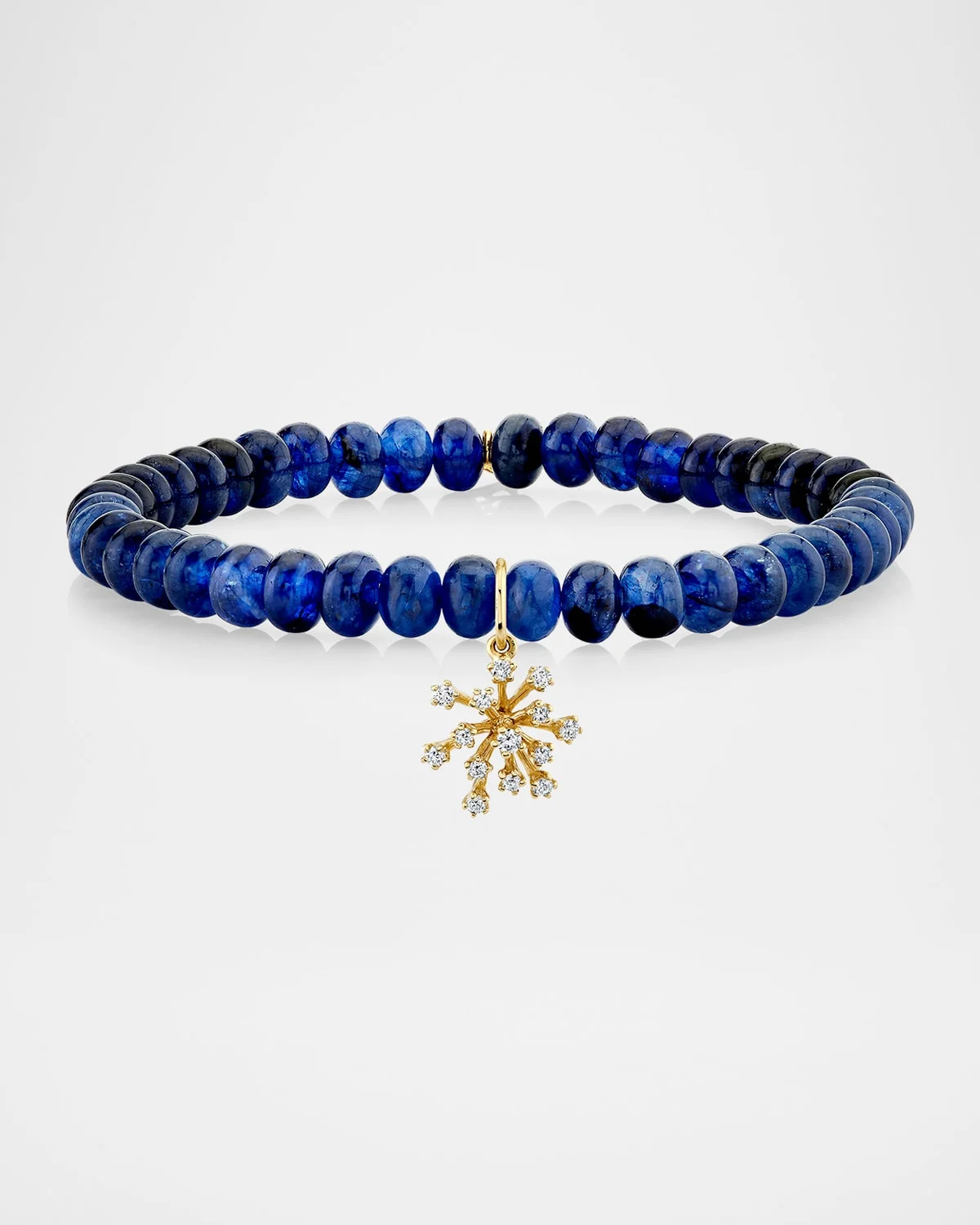 A stemmed charm, reminiscent of a wild desert flower, hangs from this Sydney Evan sapphire stone bracelet. Polished 14karat yellow gold 14 HI colorless diamonds 0.0818 total diamond carat weight Smooth, blue sapphire stones Stretches to fit Imported
