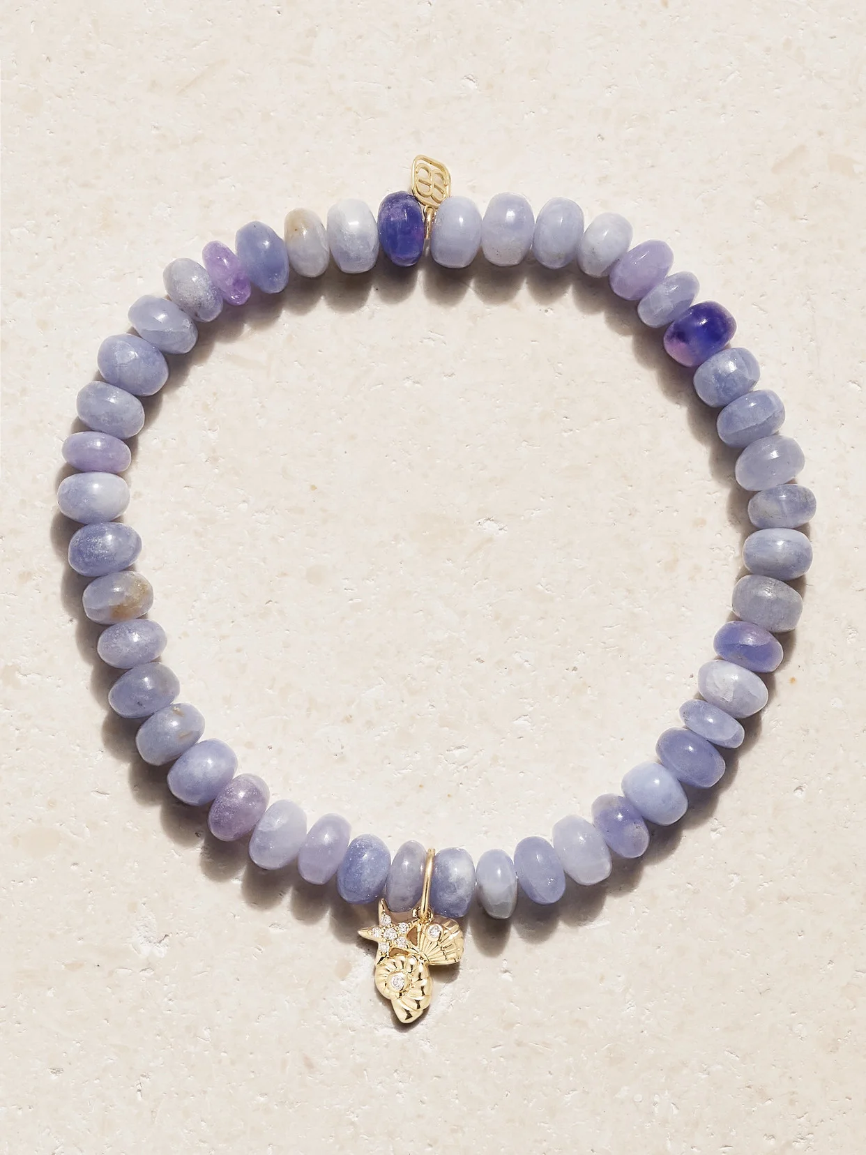 Sydney Evan's bracelet is beaded with hackmanite - each stone is tumbled and clouded in pretty shades of purple. Resembling a trio of seashells, it's tipped with a 14-karat gold and shimmers with diamonds, so it catches the light.