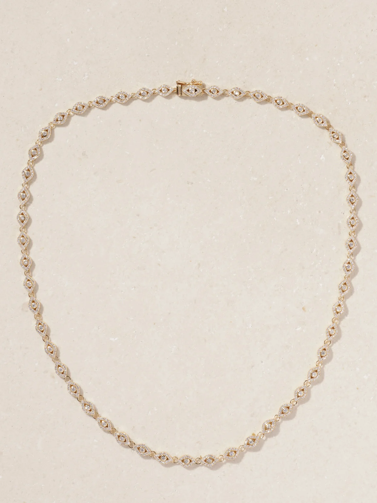 Sydney Evan's necklace has 14-karat gold chain links cast to resemble connected evil eye motifs - a recurring symbol throughout the collections, the ancient talisman is believed to ward of negative energy. It's dotted with diamonds for a sparkling finish and has a 16-inch length.