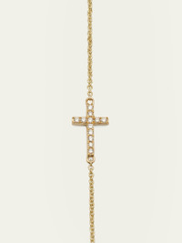14karat solid yellow gold. Integrated cross pendant with pave white diamonds. 0.05 total diamond carat weight. Small cable chain necklace. Adjustable length; approx. 16"18"L. Pendant, 1/4"L x 1/3"W. Lobster clasp.
