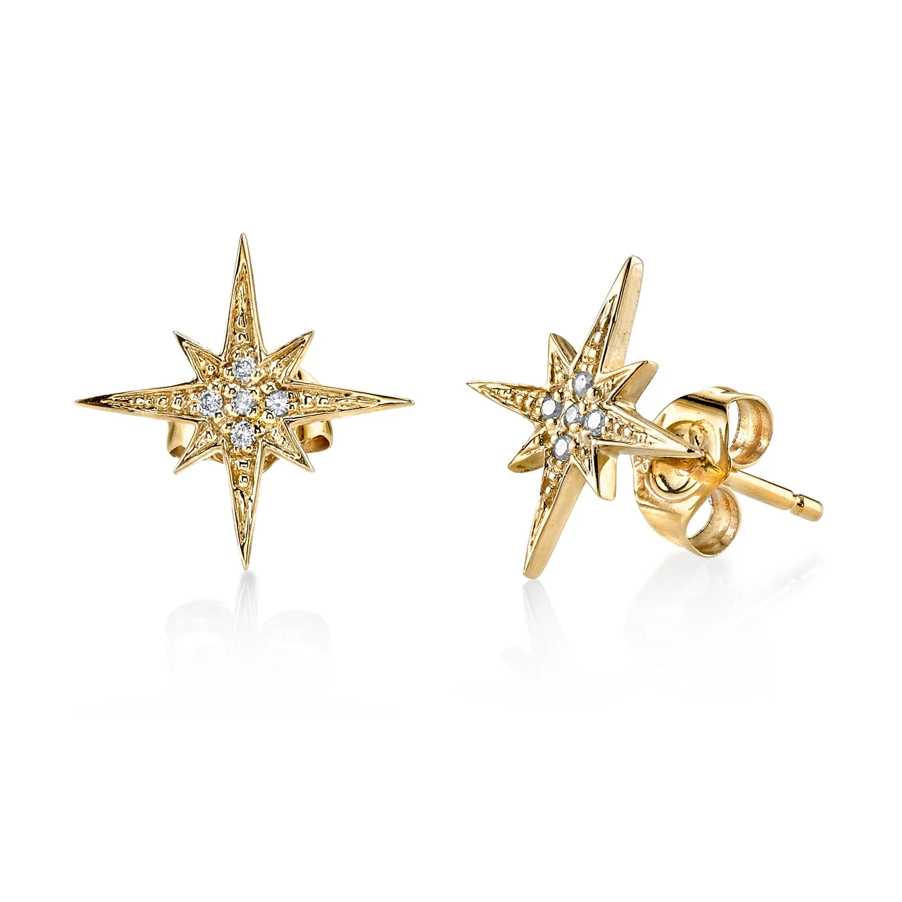 14k gold & pave diamond small starburst stud earring. The starburst measures approximately 1/2" x 1/2". 14k gold post and backing. Sold as a single earring