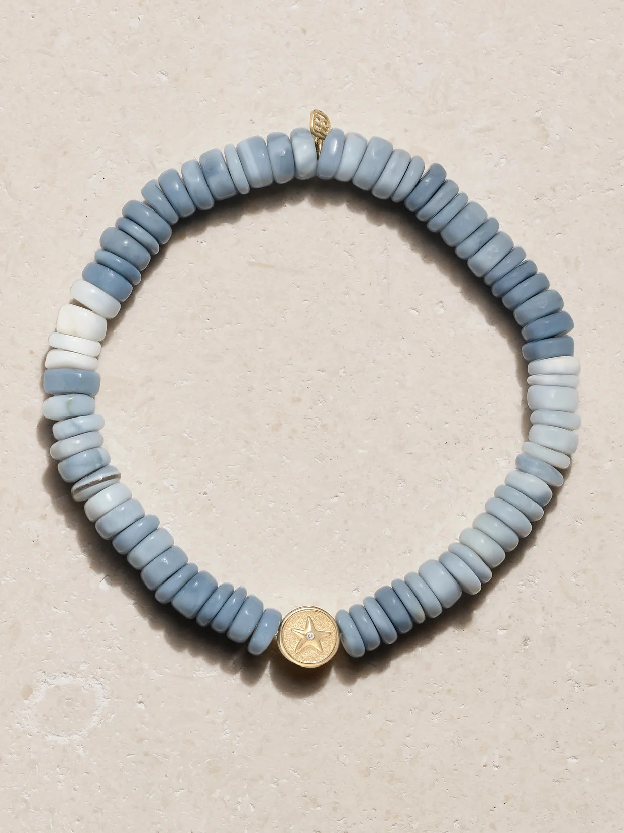 The 14-karat gold charm on Sydney Evan's bracelet is engraved with a starfish on one side and a seashell on the other, each dotted with a single diamond. It's strung with opal beads in ocean-blue hues - their irregular shapes create a beachy, bohemian feel.