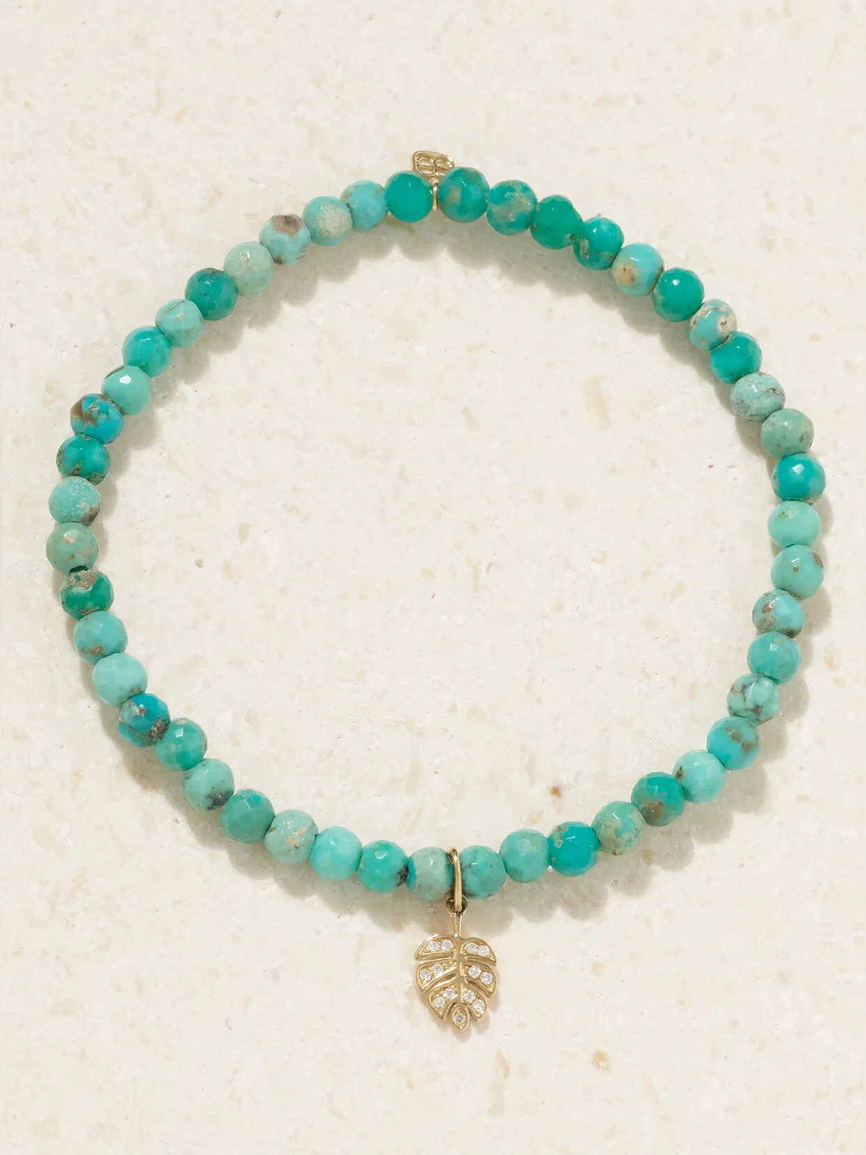 Sydney Evan's whimsical charms often have meaning behind them - the diamond-encrusted, 14-karat gold monstera leaf on this bracelet is a symbol of longevity, honor and respect. It's strung with turquoise and dendrite opal beads that are carved and faceted by hand. Echo founder Rosanne Karmes by stacking yours with similar styles.