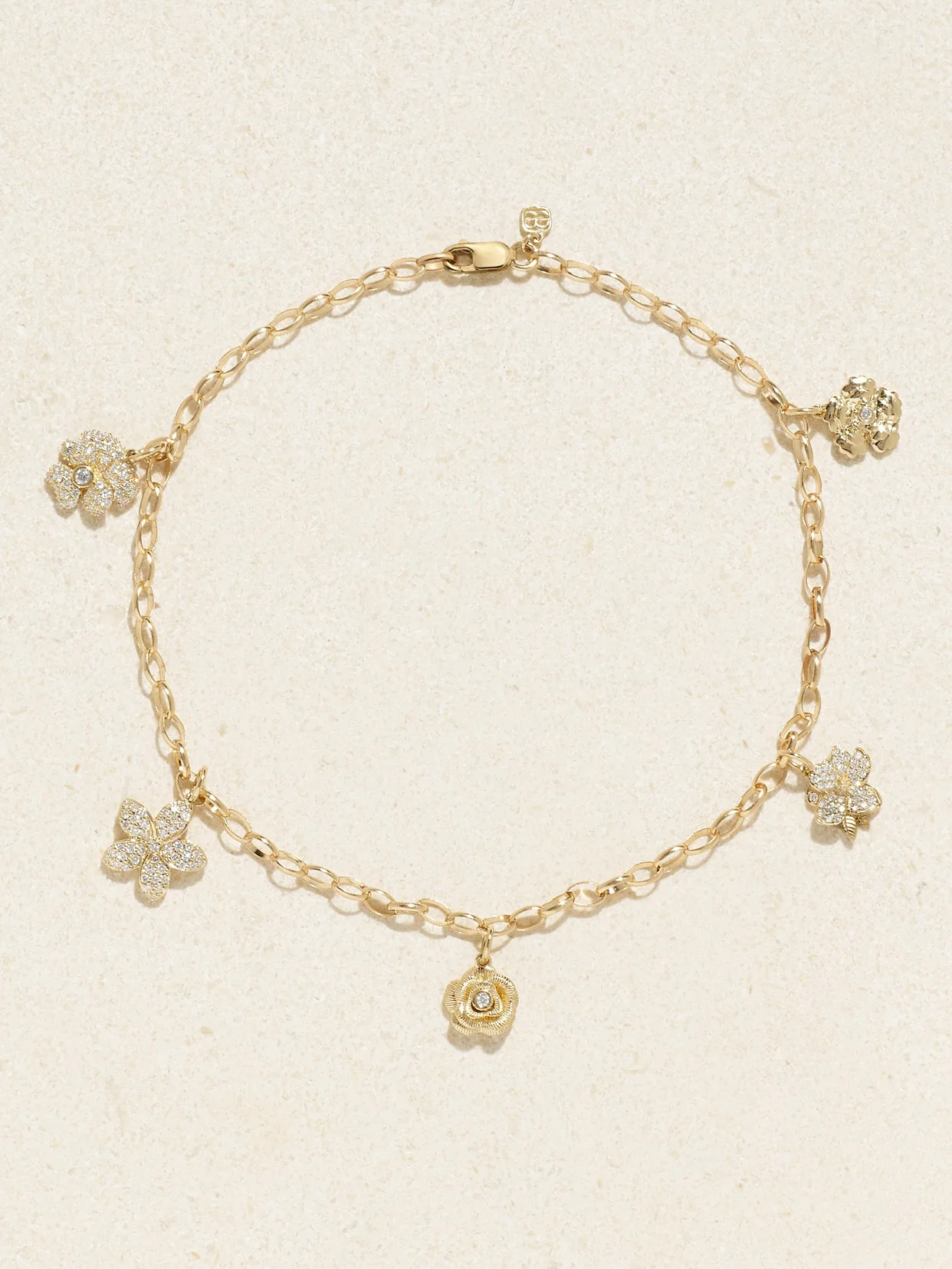 Sydney Evan's jewelry is rooted in symbolism, which makes each piece feel that much more special. This anklet is cast from 14-karat gold and strung with a variety of diamond-encrusted flower pendants, which are meant to represent the "blooming of new beginnings" and "beauty of personal growth".