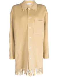 fringed-hem single-breasted coat Highlights - Beige - Wool blend - Classic collar - Front button fastening - Chest patch pocket - Long sleeves - Buttoned cuffs - Fringed edge Imported Composition Wool 86%, Nylon 14%