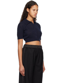 Crocheted cotton- and acrylic-blend cardigan. · Rib knit spread collar, hem, and cuffs · Button closure · Cropped hem · Logo hardware at back collar Supplier color: Dark navy 52% acrylic, 48% cotton. Made in South Korea 231494F109005